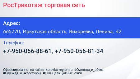 РосТрикотаж, торговая сеть по адресу 665770, Иркутская область, Вихоревка, Ленина, 42 в дальнейшем Организация, размещена в следующих категориях:
