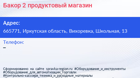 Бакор-2, продуктовый магазин по адресу 665771, Иркутская область, Вихоревка, Школьная, 13 в дальнейшем Организация, размещена в следующих категориях: