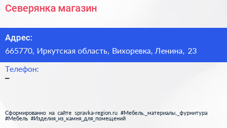 Северянка, магазин по адресу 665770, Иркутская область, Вихоревка, Ленина, 23 в дальнейшем Организация, размещена в следующих категориях: