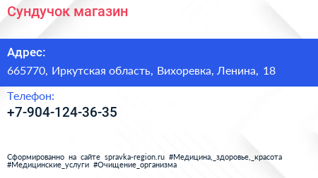 Сундучок, магазин по адресу 665770, Иркутская область, Вихоревка, Ленина, 18 в дальнейшем Организация, размещена в следующих категориях: