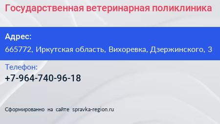 Государственная ветеринарная поликлиника по адресу 665772, Иркутская область, Вихоревка, Дзержинского, 3 в дальнейшем Организация, размещена в следующих категориях: