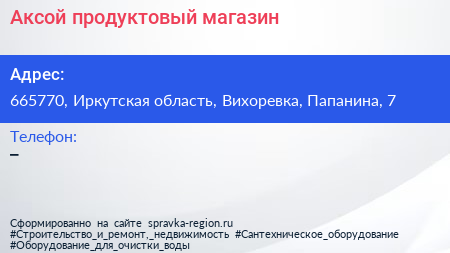 Аксой, продуктовый магазин по адресу 665770, Иркутская область, Вихоревка, Папанина, 7 в дальнейшем Организация, размещена в следующих категориях: