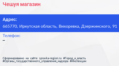 Чешуя, магазин по адресу 665770, Иркутская область, Вихоревка, Дзержинского, 91 в дальнейшем Организация, размещена в следующих категориях: