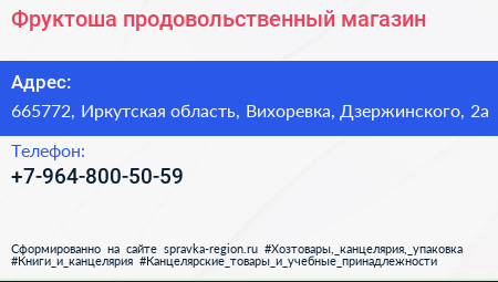 Фруктоша, продовольственный магазин по адресу 665772, Иркутская область, Вихоревка, Дзержинского, 2а в дальнейшем Организация, размещена в следующих категориях: