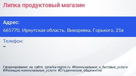 Липка, продуктовый магазин по адресу 665770, Иркутская область, Вихоревка, Горького, 21в в дальнейшем Организация, размещена в следующих категориях: