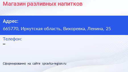 Магазин разливных напитков по адресу 665770, Иркутская область, Вихоревка, Ленина, 25 в дальнейшем Организация, размещена в следующих категориях:
