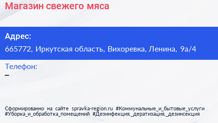 Магазин свежего мяса по адресу 665772, Иркутская область, Вихоревка, Ленина, 9а/4 в дальнейшем Организация, размещена в следующих категориях: