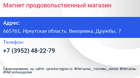 Магнит, продовольственный магазин по адресу 665761, Иркутская область, Вихоревка, Дружбы, 7 в дальнейшем Организация, размещена в следующих категориях: