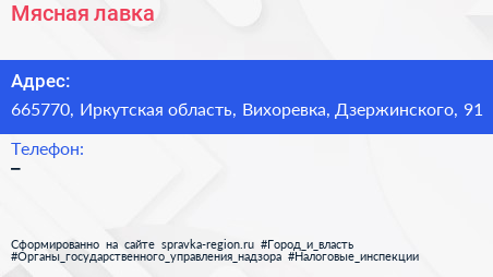 Мясная лавка по адресу 665770, Иркутская область, Вихоревка, Дзержинского, 91 в дальнейшем Организация, размещена в следующих категориях: