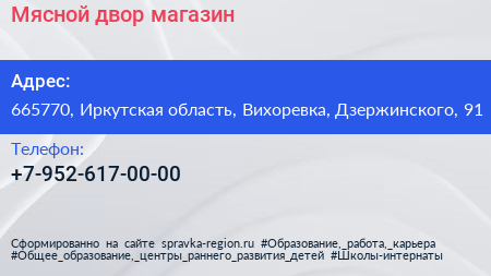 Мясной двор, магазин по адресу 665770, Иркутская область, Вихоревка, Дзержинского, 91 в дальнейшем Организация, размещена в следующих категориях: