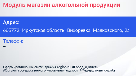 Модуль, магазин алкогольной продукции по адресу 665772, Иркутская область, Вихоревка, Маяковского, 2а в дальнейшем Организация, размещена в следующих категориях: