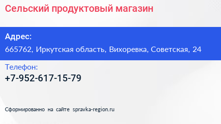 Сельский, продуктовый магазин по адресу 665762, Иркутская область, Вихоревка, Советская, 24 в дальнейшем Организация, размещена в следующих категориях: