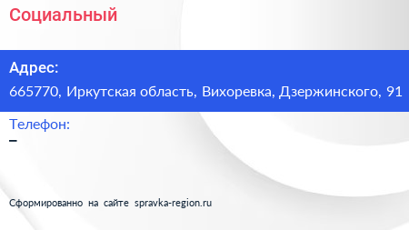 Социальный по адресу 665770, Иркутская область, Вихоревка, Дзержинского, 91 в дальнейшем Организация, размещена в следующих категориях: