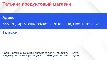 Татьяна, продуктовый магазин по адресу 665770, Иркутская область, Вихоревка, Постышева, 7а в дальнейшем Организация, размещена в следующих категориях: