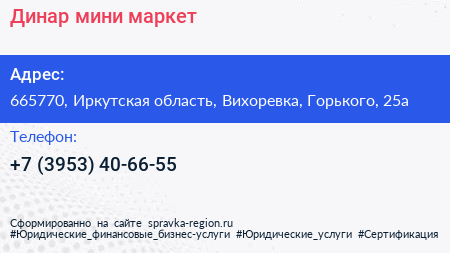 Динар, мини-маркет по адресу 665770, Иркутская область, Вихоревка, Горького, 25а в дальнейшем Организация, размещена в следующих категориях: