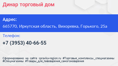 Динар, торговый дом по адресу 665770, Иркутская область, Вихоревка, Горького, 25а в дальнейшем Организация, размещена в следующих категориях: