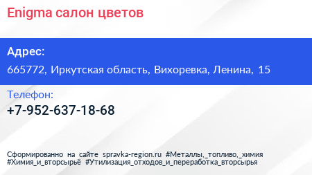 Enigma, салон цветов по адресу 665772, Иркутская область, Вихоревка, Ленина, 15 в дальнейшем Организация, размещена в следующих категориях: