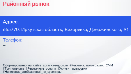 Районный рынок по адресу 665770, Иркутская область, Вихоревка, Дзержинского, 91 в дальнейшем Организация, размещена в следующих категориях: