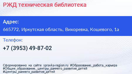 РЖД, техническая библиотека по адресу 665772, Иркутская область, Вихоревка, Кошевого, 1а в дальнейшем Организация, размещена в следующих категориях: