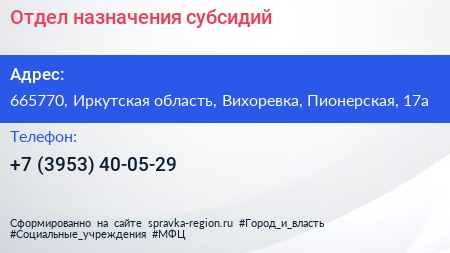 Отдел назначения субсидий по адресу 665770, Иркутская область, Вихоревка, Пионерская, 17а в дальнейшем Организация, размещена в следующих категориях: