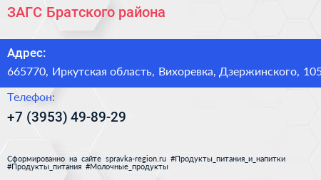 ЗАГС Братского района по адресу 665770, Иркутская область, Вихоревка, Дзержинского, 105 в дальнейшем Организация, размещена в следующих категориях: