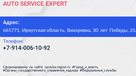 AUTO-SERVICE EXPERT по адресу 665771, Иркутская область, Вихоревка, 30 лет Победы, 21а в дальнейшем Организация, размещена в следующих категориях:
