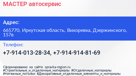 МАСТЕР, автосервис по адресу 665770, Иркутская область, Вихоревка, Дзержинского, 157в в дальнейшем Организация, размещена в следующих категориях: