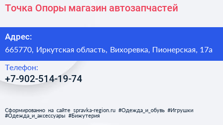 Точка Опоры, магазин автозапчастей по адресу 665770, Иркутская область, Вихоревка, Пионерская, 17а в дальнейшем Организация, размещена в следующих категориях:
