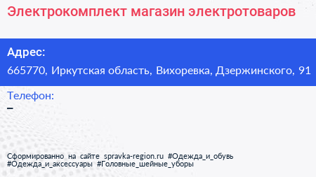 Электрокомплект, магазин электротоваров по адресу 665770, Иркутская область, Вихоревка, Дзержинского, 91 в дальнейшем Организация, размещена в следующих категориях: