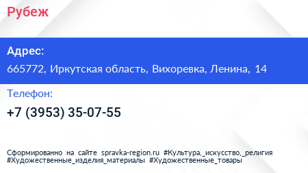 Рубеж по адресу 665772, Иркутская область, Вихоревка, Ленина, 14 в дальнейшем Организация, размещена в следующих категориях: