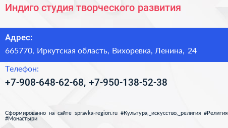 Индиго, студия творческого развития по адресу 665770, Иркутская область, Вихоревка, Ленина, 24 в дальнейшем Организация, размещена в следующих категориях: