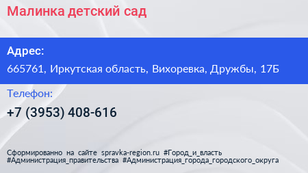 Малинка, детский сад по адресу 665761, Иркутская область, Вихоревка, Дружбы, 17Б в дальнейшем Организация, размещена в следующих категориях: