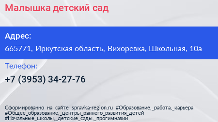 Малышка, детский сад по адресу 665771, Иркутская область, Вихоревка, Школьная, 10а в дальнейшем Организация, размещена в следующих категориях: