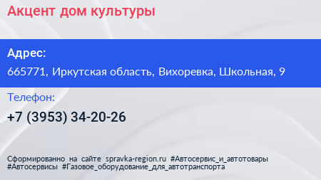 Акцент, дом культуры по адресу 665771, Иркутская область, Вихоревка, Школьная, 9 в дальнейшем Организация, размещена в следующих категориях: