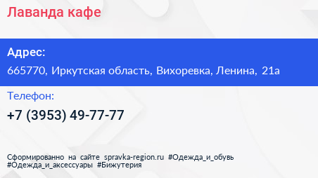 Лаванда, кафе по адресу 665770, Иркутская область, Вихоревка, Ленина, 21а в дальнейшем Организация, размещена в следующих категориях: