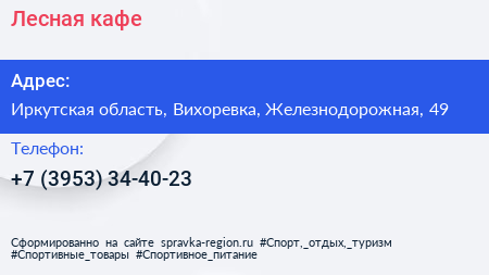 Лесная, кафе по адресу Иркутская область, Вихоревка, Железнодорожная, 49 в дальнейшем Организация, размещена в следующих категориях: