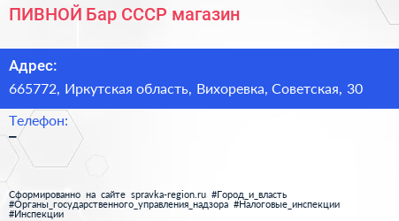 ПИВНОЙ Бар СССР, магазин по адресу 665772, Иркутская область, Вихоревка, Советская, 30 в дальнейшем Организация, размещена в следующих категориях: