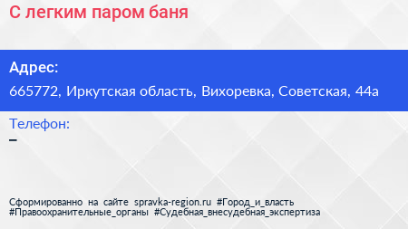 С легким паром, баня по адресу 665772, Иркутская область, Вихоревка, Советская, 44а в дальнейшем Организация, размещена в следующих категориях: