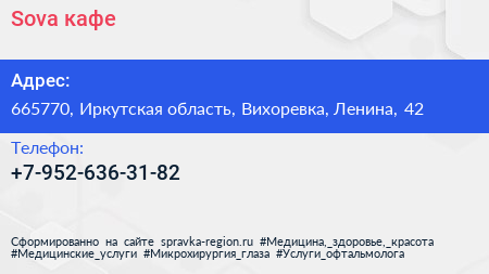 Sova, кафе по адресу 665770, Иркутская область, Вихоревка, Ленина, 42 в дальнейшем Организация, размещена в следующих категориях: