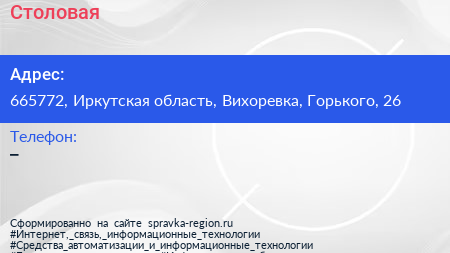 Столовая по адресу 665772, Иркутская область, Вихоревка, Горького, 26 в дальнейшем Организация, размещена в следующих категориях: