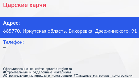 Царские харчи по адресу 665770, Иркутская область, Вихоревка, Дзержинского, 91 в дальнейшем Организация, размещена в следующих категориях: