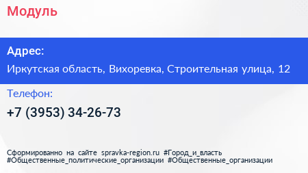 Модуль по адресу Иркутская область, Вихоревка, Строительная улица, 12 в дальнейшем Организация, размещена в следующих категориях: