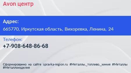 Avon, центр по адресу 665770, Иркутская область, Вихоревка, Ленина, 24 в дальнейшем Организация, размещена в следующих категориях: