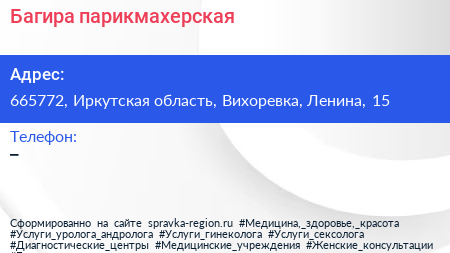 Багира, парикмахерская по адресу 665772, Иркутская область, Вихоревка, Ленина, 15 в дальнейшем Организация, размещена в следующих категориях: