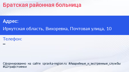 Братская районная больница по адресу Иркутская область, Вихоревка, Почтовая улица, 10 в дальнейшем Организация, размещена в следующих категориях: