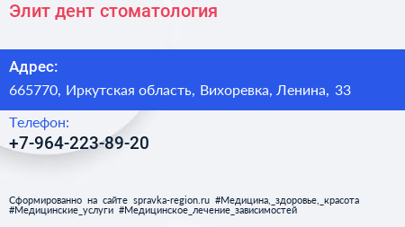 Элит-дент, стоматология по адресу 665770, Иркутская область, Вихоревка, Ленина, 33 в дальнейшем Организация, размещена в следующих категориях: