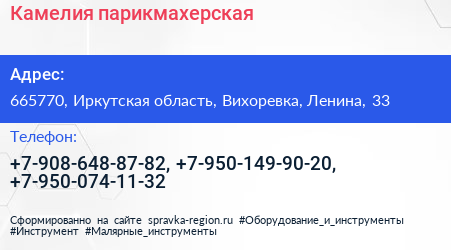 Камелия, парикмахерская по адресу 665770, Иркутская область, Вихоревка, Ленина, 33 в дальнейшем Организация, размещена в следующих категориях: