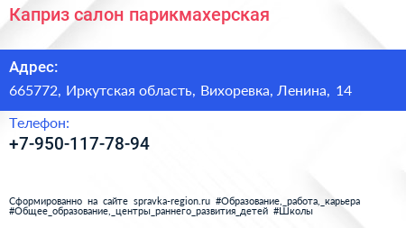 Каприз, салон-парикмахерская по адресу 665772, Иркутская область, Вихоревка, Ленина, 14 в дальнейшем Организация, размещена в следующих категориях: