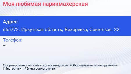Моя любимая, парикмахерская по адресу 665772, Иркутская область, Вихоревка, Советская, 32 в дальнейшем Организация, размещена в следующих категориях: