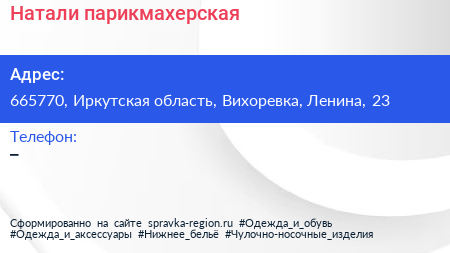 Натали, парикмахерская по адресу 665770, Иркутская область, Вихоревка, Ленина, 23 в дальнейшем Организация, размещена в следующих категориях: